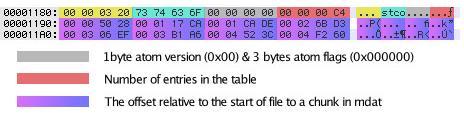 The mdat data is made up of 'chunks' - these chunks are referenced in moov to provide for seeking within the file, and to tell the player where the beginning of the media data is. This information is stored on the moov.trak.mdia.minf.stbl.stco Sample Table Chunk Offset atom. This atom has a particular structure: