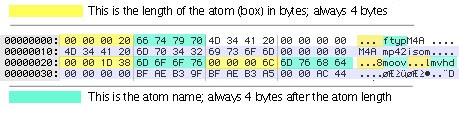 An MPEG-4 file is made of a number of discrete units called atoms (well, they were called atoms in the first version of the specification, now they are prosaically called 'boxes'). An atom has a format: